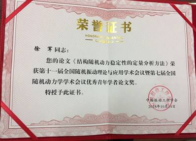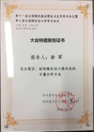 2018年10月12日-14日,第十一届全国随机振动理论与应用学术会议暨第七届全国随机动力学学术会议在湖北宜昌三峡大学举行,球友会徐军副教授在大会做了题为《结构随机动力稳定性的定量分析方法》大会邀请报告,并获得优秀青年学者论文奖。