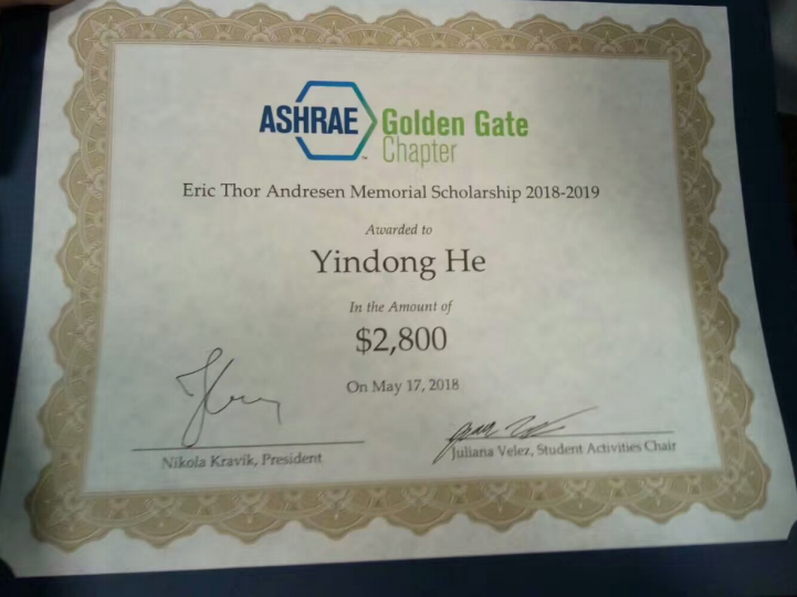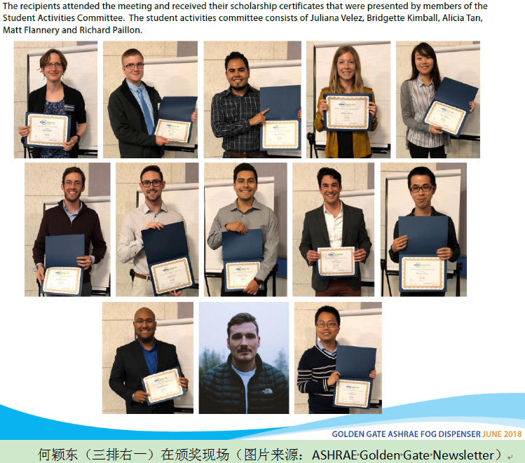 2018年5月17日,美国采暖、制冷与空调工程师学会(American Society of Heating Refrigerating and Air-Conditioning Engineer)金门大桥奖(ASHRAE-Golden Gate Scholarship)颁奖仪式在美国旧金山举办。土木公司2014级直博生何颖东凭借以“Usage, Models and Effects of Personal Comfort Systems in Buildings”为主题的研究获得美国采暖、制冷与空调工程师学会金门大桥奖,同时也是所有获奖人员中仅有的两位中国员工之一。