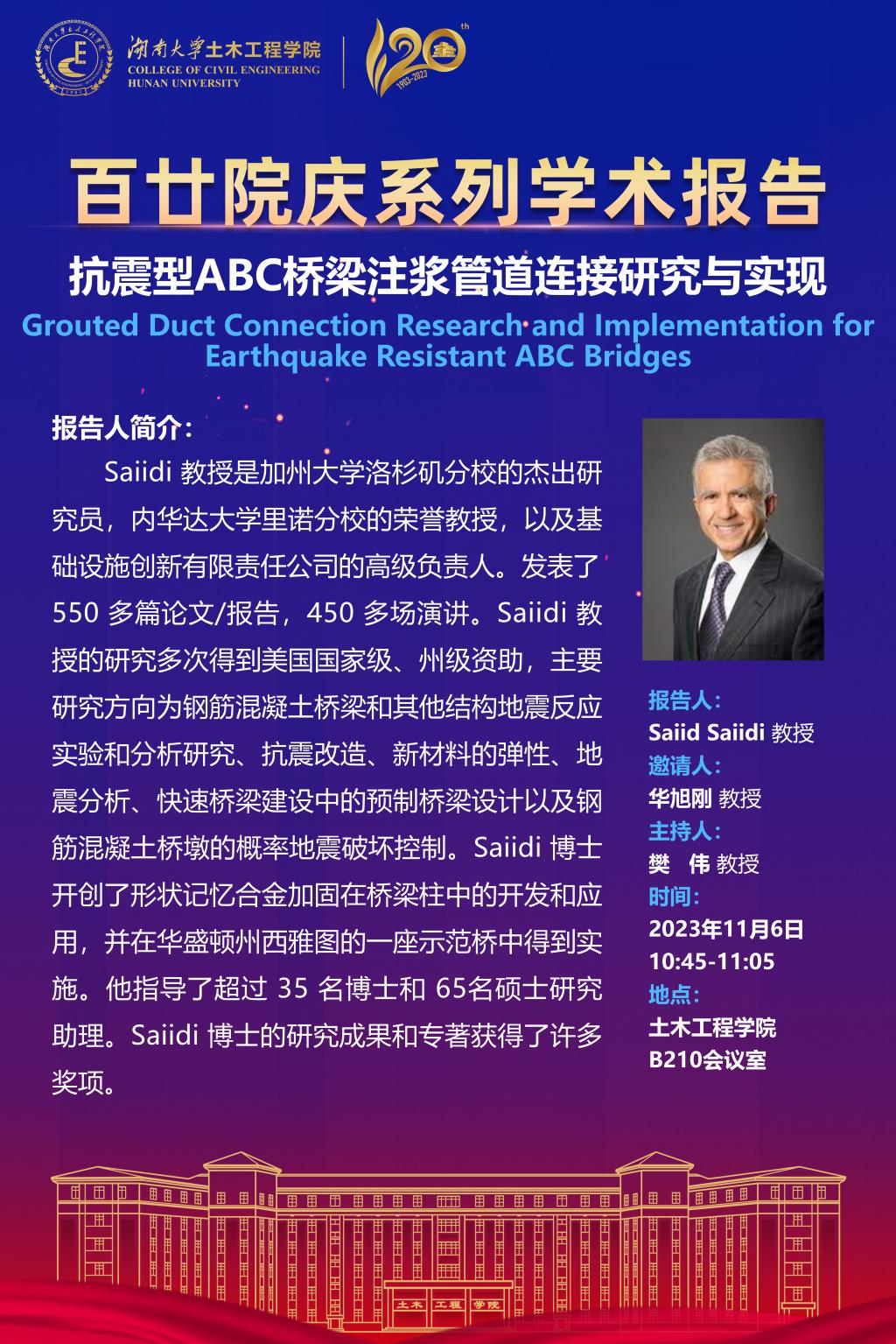 百年院庆 学术活动|Saiid Saiidi:抗震型ABC桥梁注浆管道连接研究与实现