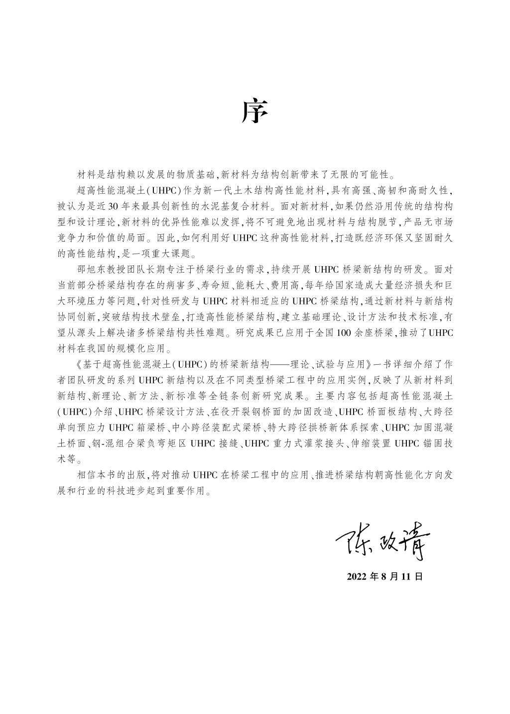 近日,公司邵旭东教授等撰写的《基于超高性能混凝土(UHPC)的桥梁新结构——理论、试验与应用》一书由人民交通出版社出版,中国工程院院士陈政清为该书作序。