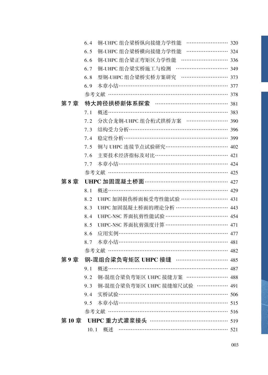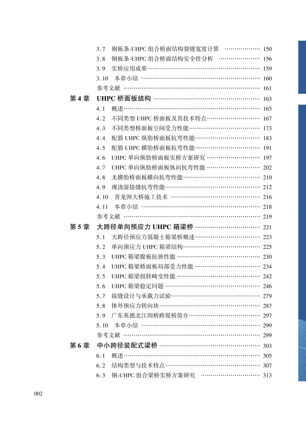 该书主要内容包括超高性能混凝土UHPC介绍;UHPC桥梁设计方法(基于邵旭东教授主编的交通运输部行业标准报批稿);在役开裂钢桥面的加固改造(目标是解决受损正交异性钢桥面板疲劳开裂和沥青铺装破损的难题);多种 UHPC桥面板结构(目标是降低自重、提高抗裂性能、提高耐久性);大跨径单向预应力UHPC箱梁桥(目标是解决传统大跨径预应力箱梁桥自重大、易开裂的难题);多种中小跨径装配式梁桥(目标是降低自重和造价、实现快速化施工、提高耐久性);特大跨径拱桥新体系(目标是建造跨径600m以上低碳高性能拱桥);混凝土桥面加固(目标是消除在役混凝土桥面病害);负弯矩区UHPC接缝(目标是简化施工,提高耐久性);UHPC灌浆接头(目标是简化施工,提高牢固性);伸缩装置UHPC锚固技术(目标是简化施工,提高抗车辆冲击性能)等。