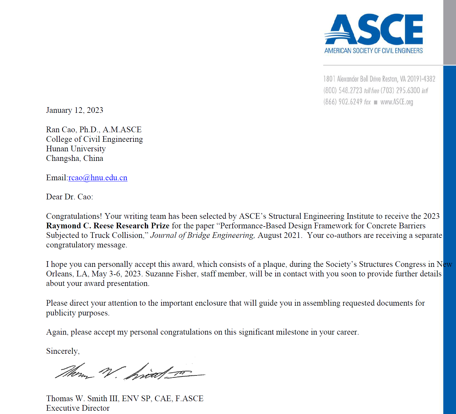 据悉,公司曹然副教授荣获由美国土木工程师协会ASCE颁发的雷蒙德·里斯奖(Raymond C. Reese Research Prize),以表彰其发表在国际桥梁领域知名期刊ASCE《Journal of Bridge Engineering》的论文《Performance-Based Design Framework for Concrete Barriers Subjected to Truck Collision》在结构工程领域的杰出贡献。雷蒙德·里斯奖设立于1970年,研究成果的应用价值是该项奖励评审的最重要依据,全球每年仅有一篇论文获此殊荣。