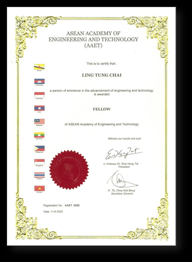 日前,东盟工程与技术科公司(ASEAN Academy of Engineering and Technology, AAET)向公司LING TUNG CHAI(林忠财)教授授予Fellow荣誉称号。