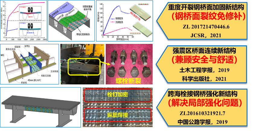 钢桥具有自重轻、强度高、易施工、可回收等优点,我国高速公路网的咽喉节点85%采用了大跨径钢桥。但钢桥面存在易疲劳开裂和沥青铺装破损两大顽症,特别是对于重度开裂、强震、海洋、寒区等严酷服役状态下的钢桥面,如何对其进行强化,以消除钢桥面的两大病害,是世界性难题,也是国家的重大需求。