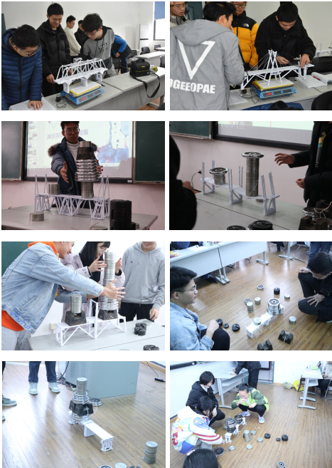由于场地空间限制,比赛分为A组和B组,分别在球友会B503和B507教室内同步举行。比赛过程中,评委老师们主要根据以下三个方面对同学们设计桥梁模型进行评分: