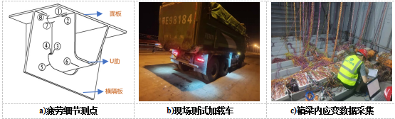 为了监测实桥应用的效果,在大桥钢桥面加固施工的不同阶段,分别对大桥在原沥青铺装、无铺装(原沥青铺装铲除)、UHPC完工后,三种桥面状态下进行试验,如图4所示。实桥监测结果表明,组合桥面与无铺装桥面相比各疲劳细节应力降幅在28%~89%之间,钢-UHPC轻型组合桥面结构显著降低了钢桥面各类疲劳细节的应力,从根源上降低了钢桥面的疲劳病害风险。