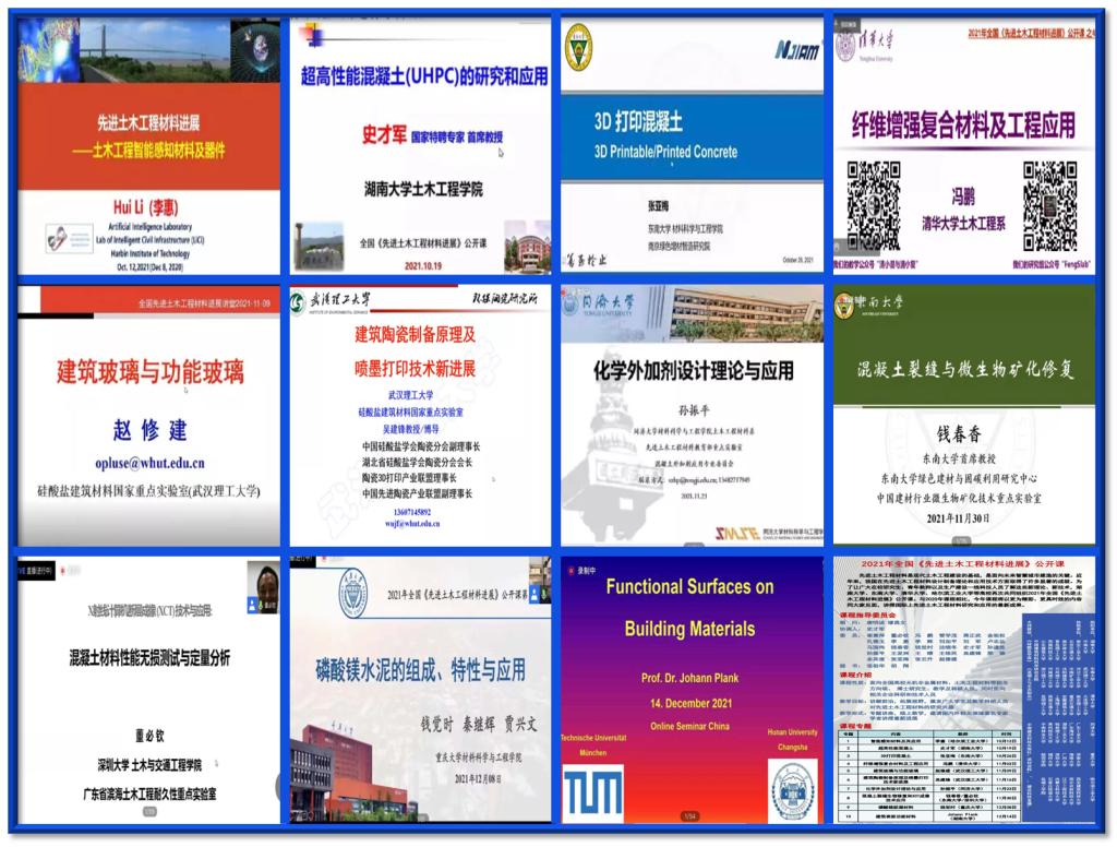 2021年第二期《先进土木工程材料进展》全国公开课由qy球友会等九所高校共同组织,全国三十余所高校协助举办,公开课同时得到了《硅酸盐学报》、《混凝土与水泥制品》、中国建筑科技出版社“谈材说料”、建设科技直播等多家单位大力支持。公开课邀请了十一位国内外著名的建筑材料与土木工程领域专家进行授课,内容涵盖了高性能水泥基材料、3D打印混凝土、功能材料、建筑陶瓷和玻璃、生物矿化材料以及外加剂等多个研究领域,旨在向在校研究生和青年教师介绍土木工程材料领域的前沿理论和技术成果,激发广大青年学子对土木工程材料的研究兴趣。
