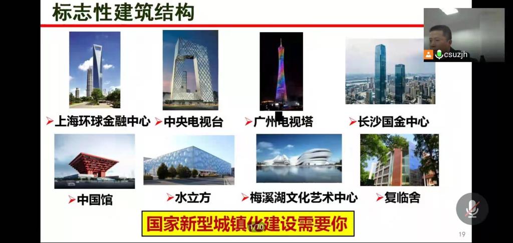 随后,精心准备的各专业(方向)老师给同学们上了一堂精彩绝伦的专业教育课。陈大川教授从工程管理做什么、工程管理学什么、什么人学三个方面介绍了工程管理专业。黄远教授分析了建筑工程的就业前景和发展方向。樊伟教授诗情画意地以“桥”、“湖大桥”、“你们的桥”三个关键词鼓励同学们结合国家战略需求,积极投身中国的桥梁建设。吴怀娜教授重点讲解了地下空间专业的专业特点、教育理念和培养特色。李洁副教授详细介绍了道路工程专业方向情况和特点,并就《交通强国建设纲要》角度谈选择道路工程的优势。史才军教授着重强调了建材中心的团队力量和科研实力,欢迎同学们加入建材温馨大家庭。同时,各位老师线上积极为同学们答疑解惑。
