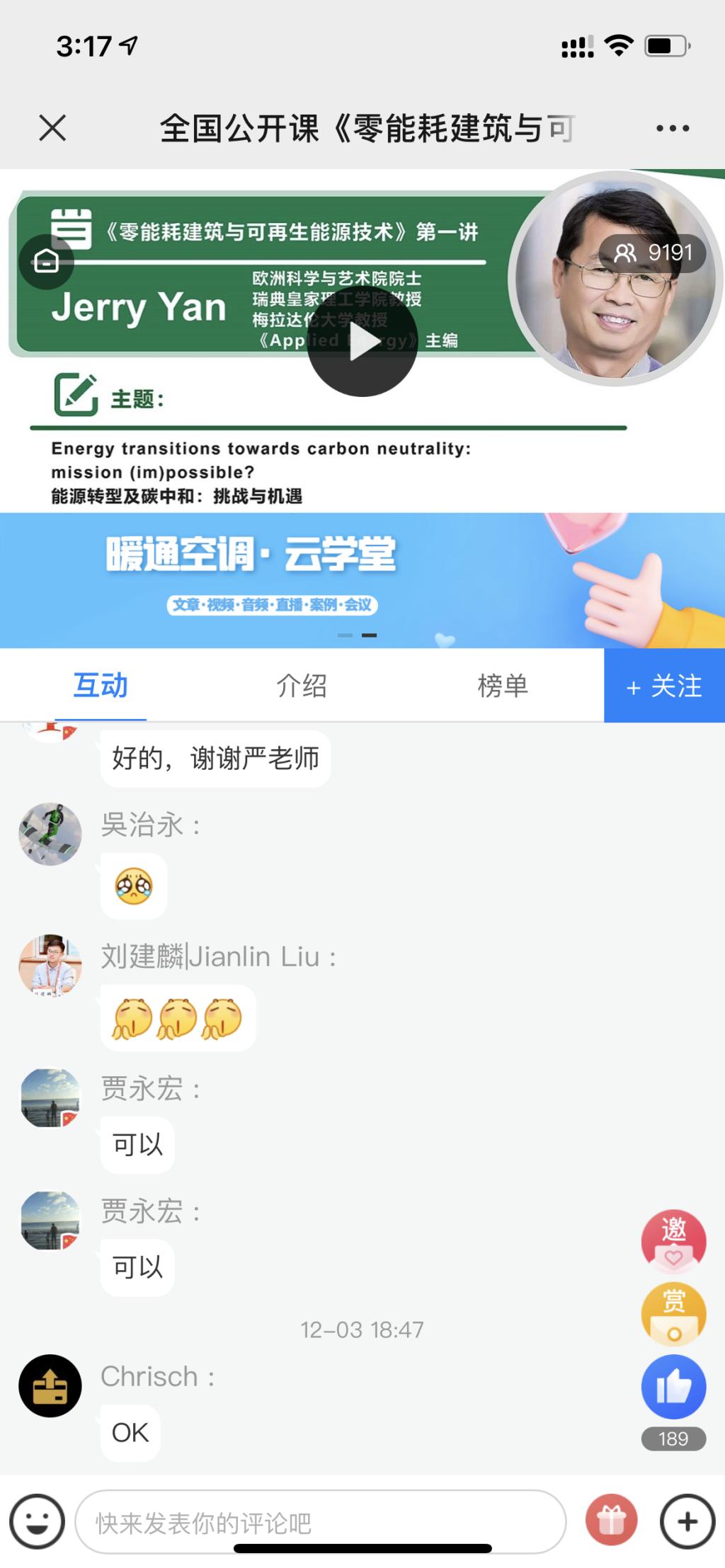 本次公开课采取“线上+线下”的方式,线下组织本校师生在球友会报告厅集中学习,同时还吸引了其他院校师生和企业高层管理者亲临现场参与。线上采取同步直播方式对外开放,将高品质教育资源分享给全社会。公开课直播期间,单场在线观众高达九千多人,累积在线观众超六万人次,极大的扩大了课程的受众群体。课堂气氛十分活跃,大量观众参与互动交流,加深了相关研究和技术的体会与理解,并碰撞出了新的火花,对大力发展零能耗建筑与可再生能源技术具有重要意义。课程效果超出预期,在业内收获了良好口碑,包括清华、浙大、香港理工、哈工大、同济等在内的高校员工纷纷对课程的组织形式和内容给予了高度评价。本课程的顺利举办是球友会在开展新工科教育方面的又一创新举措,是“双一流”建设背景下土木类研究生国际联合培养模式探索与实践的新成果,为零能耗建筑与可再生能源技术普及提供了一个重要平台,同时也大大提高了qy球友会建环专业的国内外影响力。