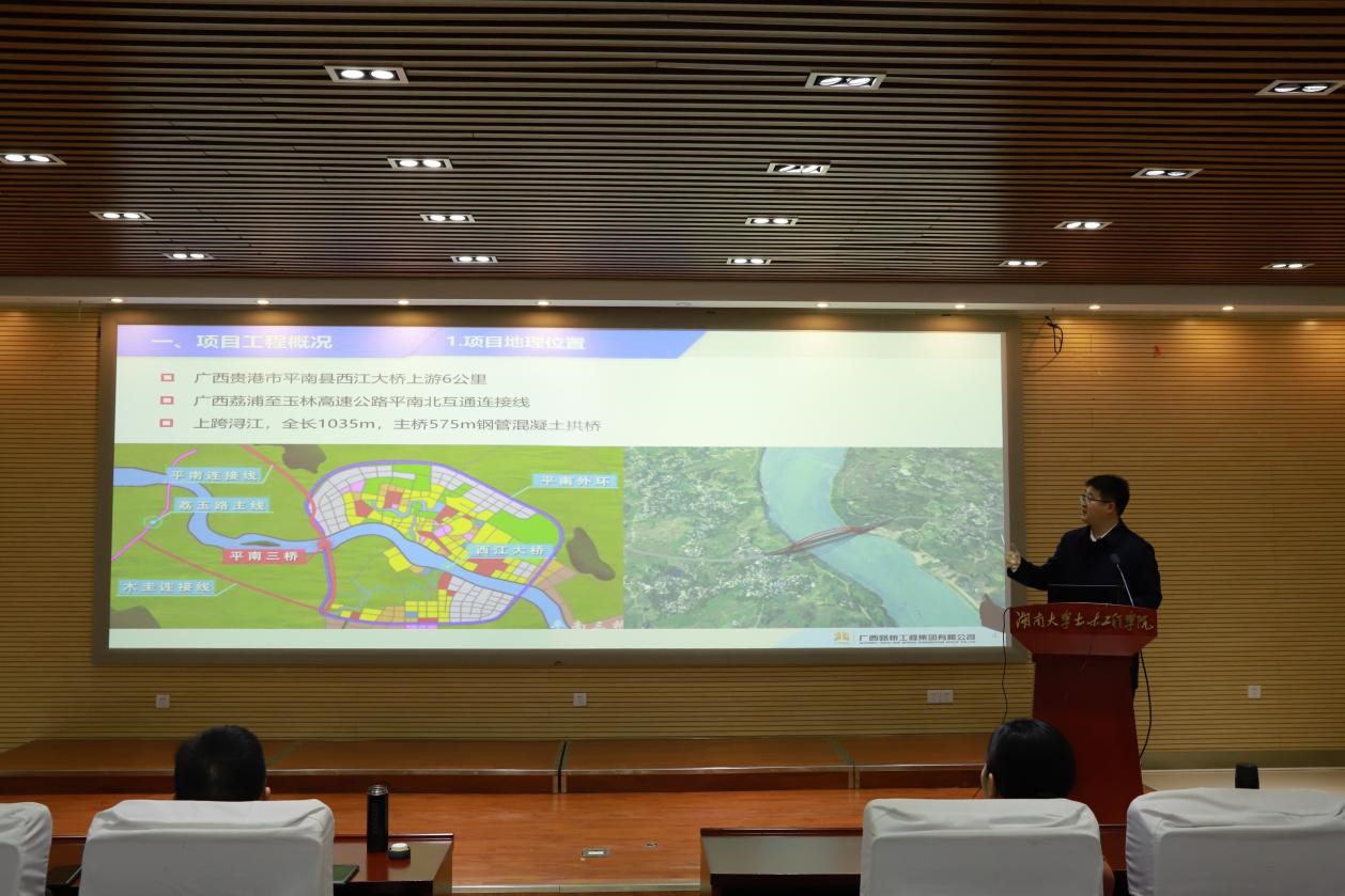 杜海龙就平南三桥项目卵石地层地连墙成槽、大体积混凝土防裂、缆索吊运安装系统、超大跨拱肋安装线形控制、管内混凝土灌注等施工重点难点问题进行了介绍,并结合个人的学习成长经历,从就业择业、职业规划、学习提升等方面与全体同学进行了分享和交流,寄语在座学子们博学笃志、掌握科学知识,自我拓展、练就过硬本领,知行合一、扎根中国大地。