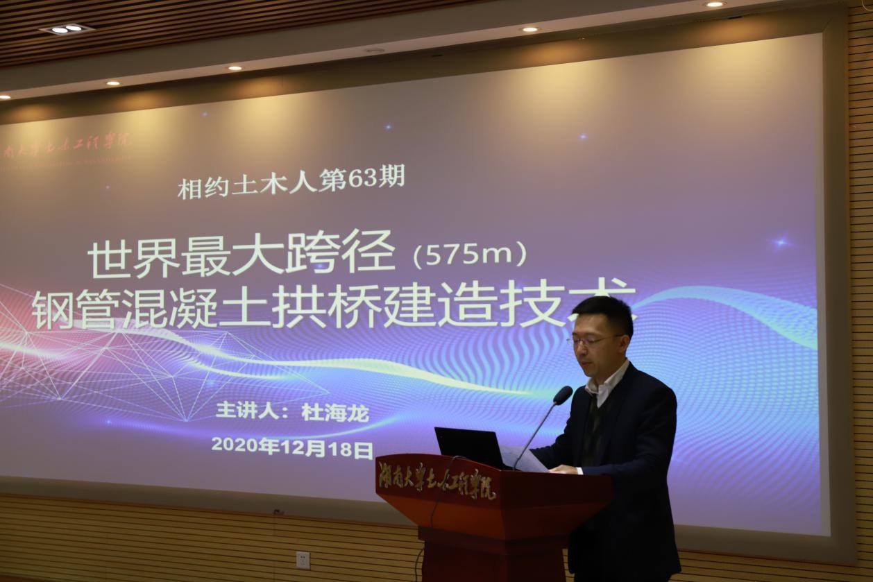 12月18日,土木院“相约土木人”报告会在公司报告厅举行。球友会2003届员工,2020年“全国十大桥梁人物”获得者杜海龙做《世界最大跨径(575m)钢管混凝土拱桥建造技术》报告,公司领导、相关专业教师及200余名员工代表参加。报告会由邓露教授主持。
