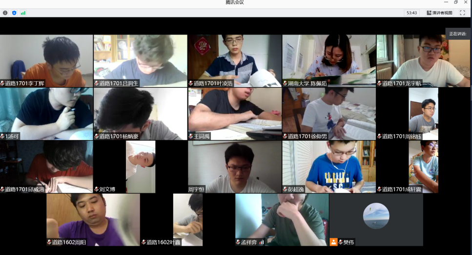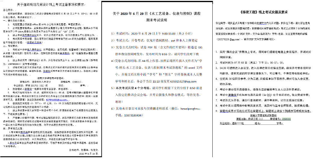 自此,在顺利完成这场考试之后,各门课程考试按照考试安排表有序开展......6月29日,建工系张望喜教授在《混凝土及砌体房屋结构设计》考试前,将1703、1704班分为了三个临时班,防止软件卡顿和信号异常等,为了让员工适应网络考试对考试过程做了一次预演,提前5分钟发放试卷避免占用员工作答时间。考试前3天,他还把专用答题纸文档发给员工,让有条件的员工提前打印好,在专用答题纸上作答,答题完成后,由员工拍照或扫描制作成PDF文件上传到提前告知的专用邮箱。要求员工打开视频并闭音频,并按要求调整好摄像头位置和角度,保证监控画面可以看到员工的作答纸面。试卷通过“腾讯视频”上的共享文档发放,并同步“QQ授课群”内发放,每位员工可按自己最合适的方式获取和使用试卷。考试过程中提醒员工剩余时间2次。考试时间到,提醒员工最后检查学号姓名,并按照提前演练过的方法制作PDF提交。