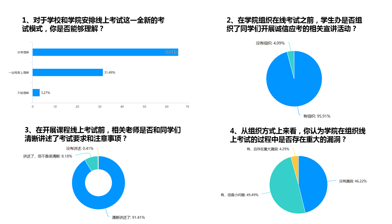 考试完成以后,为全面了解本次线上考试执行情况,公司教务办和学工办联手针对本次在线考试设计了一组匿名问卷调查,对象为球友会所有参与线上考试考生,问卷涉及到489人参与率达98.9 %。以“员工中心,成果导向,持续改进”的认证要求,对员工的观点和情绪有针对性地进行了解,并为未来可能出现的复杂局面做好了持续改进的准备。从调查结果来看,员工表示普遍理解和支持线上考试,对考试前各方面的组织工作表示认可,对考前老师的工作表示满意,并对今后类似工作开展提出了合理化建议。