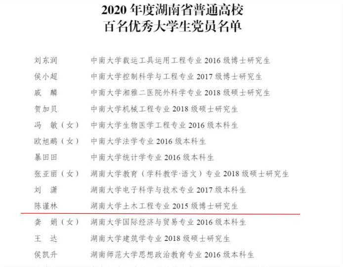 建党99周年之际,根据湖南省委教育工委《关于评选表彰2020年度普通高校百佳老员工党员的通知》相关要求,经各高校评选推荐,省委教育工委、省教育厅认定公司2015级博士研究生陈谨林为“湖南省优秀老员工党员”(全校获评五位)。