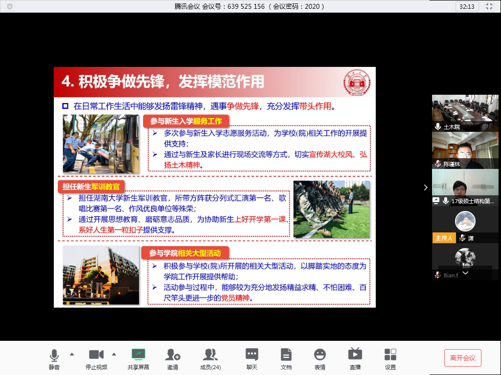 博士生党员陈谨林领衔的项目《磁阻尼——消能减振新技术》斩获第五届中国“互联网+”老员工创新创业大赛主赛道金奖,他从老员工党员如何发挥先锋模范作用、做好价值引领、扎实专业、追求创新展开自述,他号召老员工党员要敢于“追求真理”,要懂得“回报社会”。连续三年专业加权平均分第一、硕博连读报送至国防科技大学、两年三好员工标兵的本科生党员王云飞同学以“争做一面旗帜”为答辩主题,从思想引领、帮扶结对、服务集体、科研竞赛等方面进行自述。在每位候选人自述结束后,由老师评委及员工评委针对员工党员的自述展开提问。