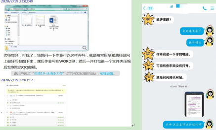 l 任课老师在QQ群里发布学习资料,布置作业。有疑问的同学可以通过qq群与老师在线讨论,第一时间解决问题,之后可以采用拍照上传或者电子档来完成作业。老师会根据群内同学的活跃状况,线上教学时的发言以及到课率、作业完成情况来对同学的平时成绩进行打分。