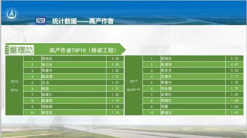 该统计数据表明:近5年来,公司在校定重点期刊《中国公路学报》桥梁工程方向发文量稳居第一。公司周绪红院士、陈政清院士、邵旭东教授、方志教授、邓露教授入选高产作者TOP10榜单,榜单占比过半,表明公司桥梁工程学科多年来持续产出高质量研究成果,在国内具有很好的学术影响力和声誉。