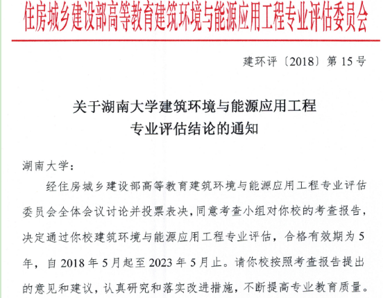 2018年6月8日,住房和城乡建设部高等教育建筑环境与能源应用工程专业评估委员会印发了《关于湖南大学建筑环境与能源应用工程专业评估结论的通知》(建环评(2018)第15号),通过了公司建筑环境与能源应用工程专业评估,有效期为5年。