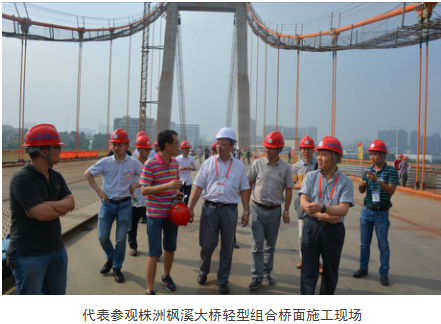 26日下午,260多位代表兴致勃勃地参观了株洲枫溪大桥施工现场,该桥系第一次在悬索桥上采用了由公司邵旭东教授团队研发的钢-STC轻型组合桥面新技术,代表们深入了解轻型组合桥面的性能和实际效果。