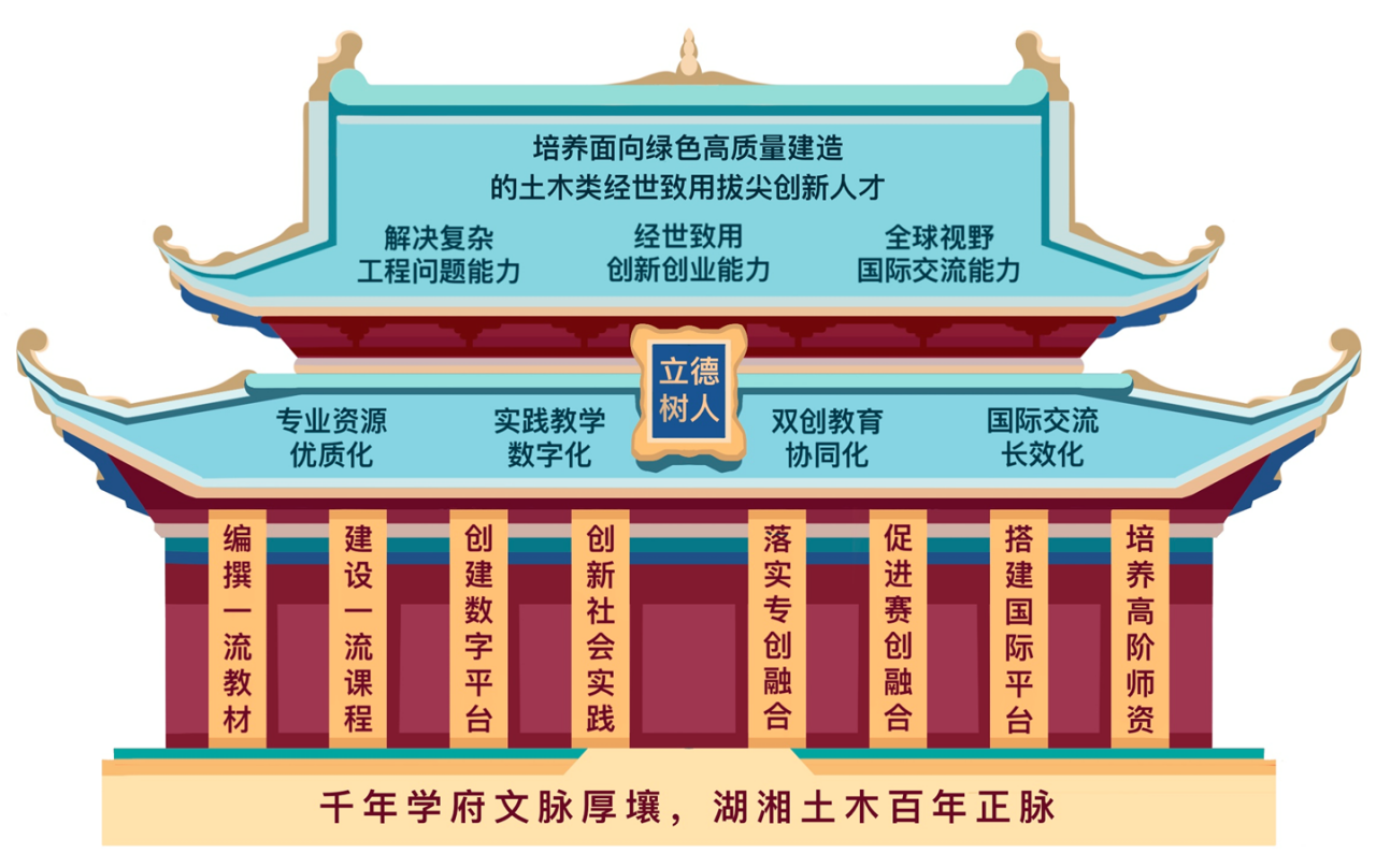 公司以立德树人为根本任务,立稳一流教材、一流课程、数字平台、社会实践、专创融合、赛创融合、国际平台、高阶团队“八柱”,架设专业资源优质化、实践教学数字化、双创育人协同化、国际交流长效化“四梁”,全面提高员工解决复杂工程问题、经世致用创新创业、全球视野国际交流的能力(三能),培养面向绿色高质量建造的土木类经世致用拔尖创新人才(一本),即“一本三能四梁八柱”人才培养模式,并于2023年获得国家级教学成果二等奖。