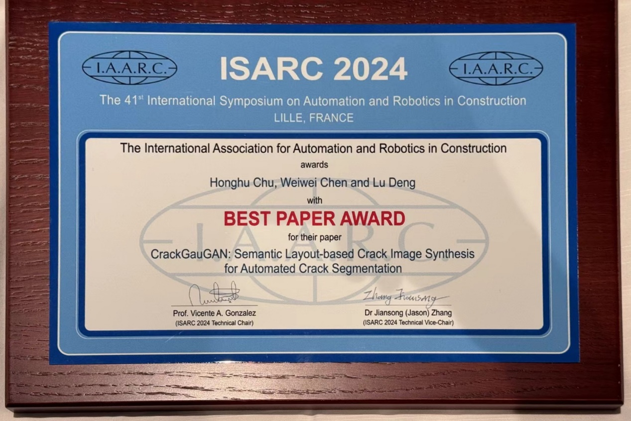 6月3日-5日,第41届国际建筑自动化和机器人国际研讨会(ISARC,International Symposium on Automation and Robotics in Construction)在法国里尔召开,公司邓露教授团队受邀做大会主旨报告。本次大会共评选12篇优秀论文,邓露教授团队2篇论文被评选为优秀论文,其中一篇获得大会唯一“最佳论文奖”。