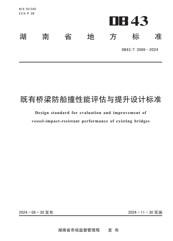 11月30日,公司樊伟教授团队与湖南省交通规划勘察设计院有限公司等合作主编的《既有桥梁防船撞性能评估与提升设计标准》(DB43/T 3066-2024)正式发布实施。