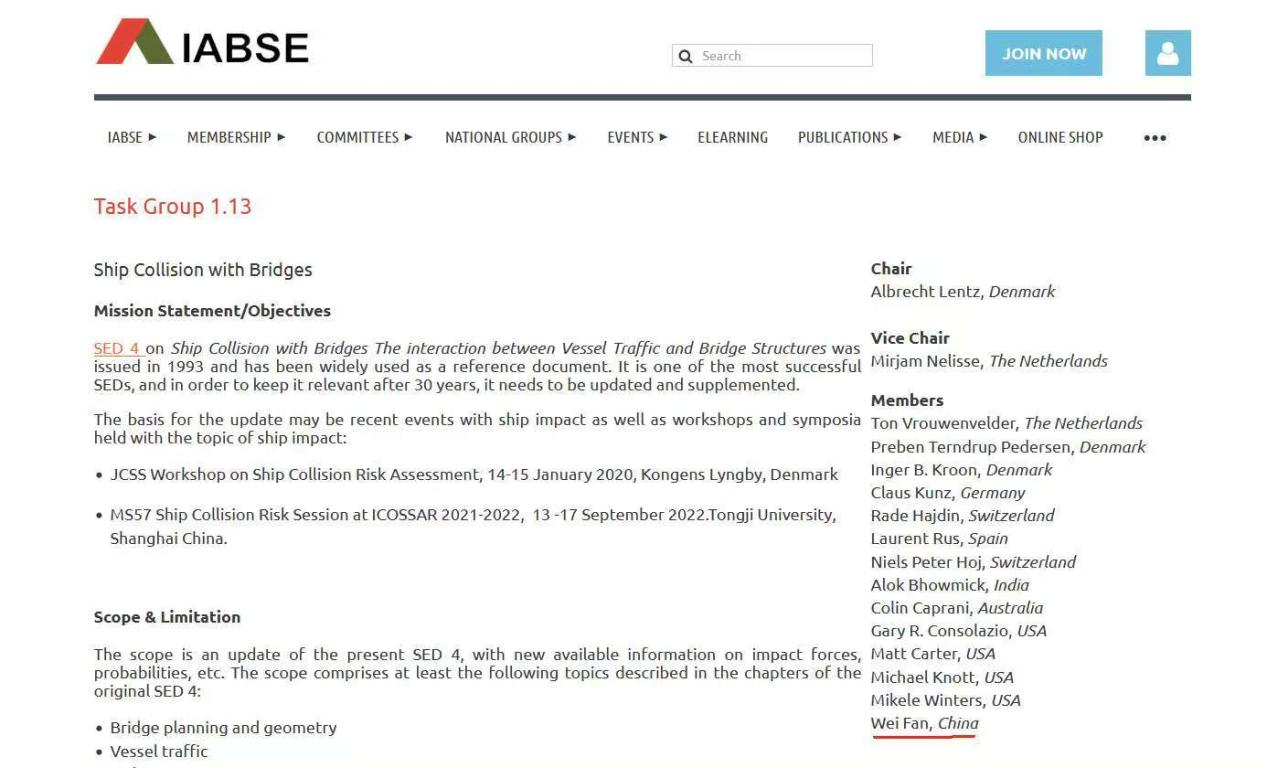 今年3月,美国巴尔的摩基桥船撞倒塌后,美国土木工程师协会ASCE和国际桥协IABSE等组织召开了桥梁船撞国际会议,樊伟受邀做大会报告,系统地分享了编制该标准过程中的理论与实践成果。此外,国际桥协特邀樊伟为桥梁船撞工作委员会委员,是目前国内唯一一位委员,该组织主要由欧洲和美国规范制定者、COWI公司技术专家等组成。