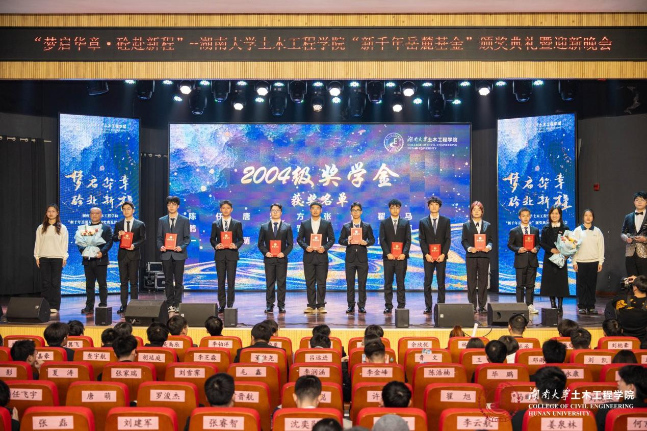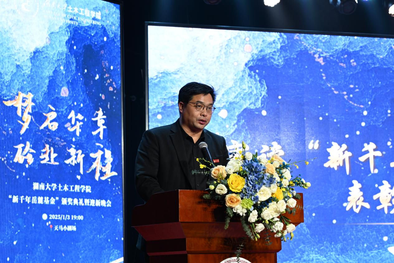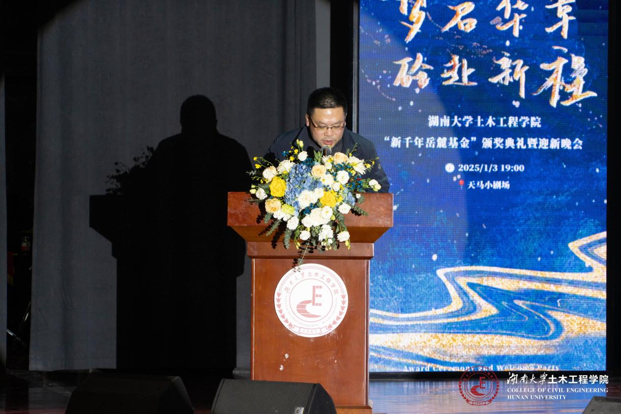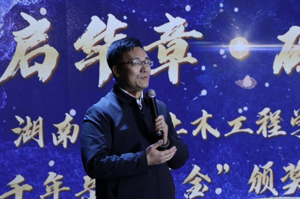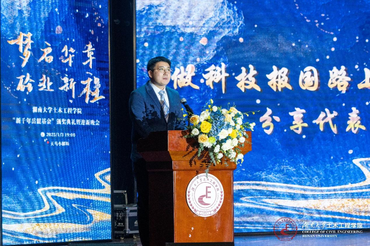 颁奖典礼上,设奖方代表和公司领导老师依次登台,为荣获 “新千年岳麓基金”的个人和集体颁发荣誉证书。96 级员工、qy球友会广州员工会常务理事李天兵作为设奖方代表分享设立“姜乃昌奖学金”背后的故事,他表示希望湖大土木人在未来机遇与挑战并存的浪潮中勇立潮头。“2004 级奖学金”获得者、本科生代表陈鹤一以“追梦青春”为题讲述大学成长故事,顺天综合奖学金”获得者、研究生代表张吉仁分享科研路上与 “风” 较量的历程,他们的故事激励大家脚踏实地、厚积薄发,争做时代 “驭风者”。
