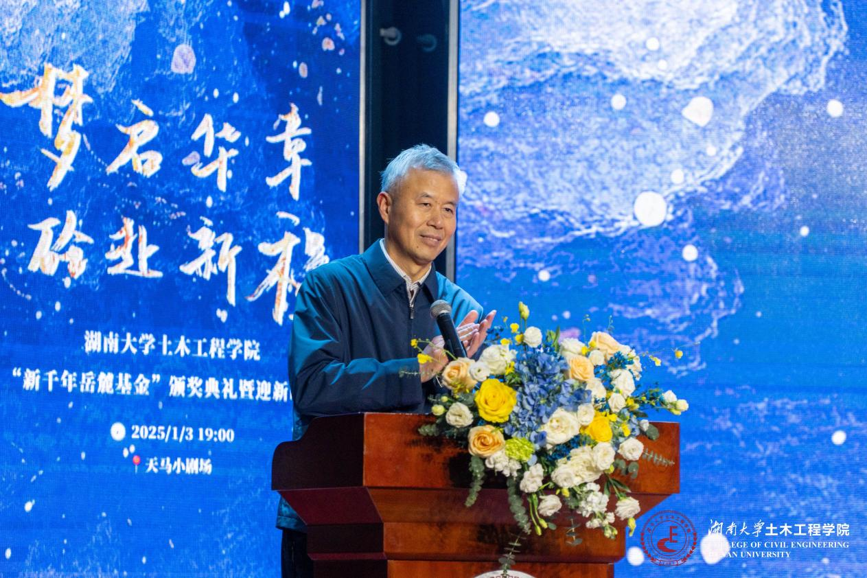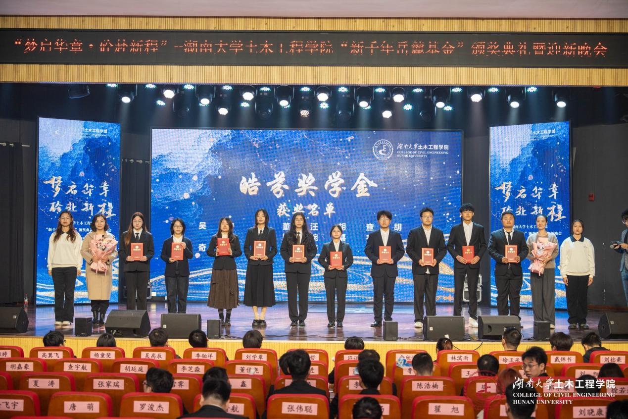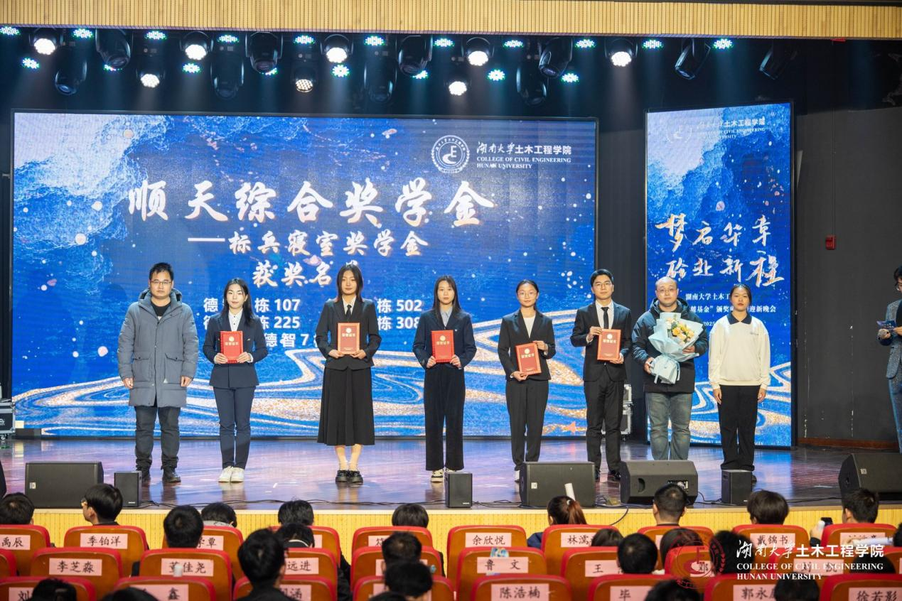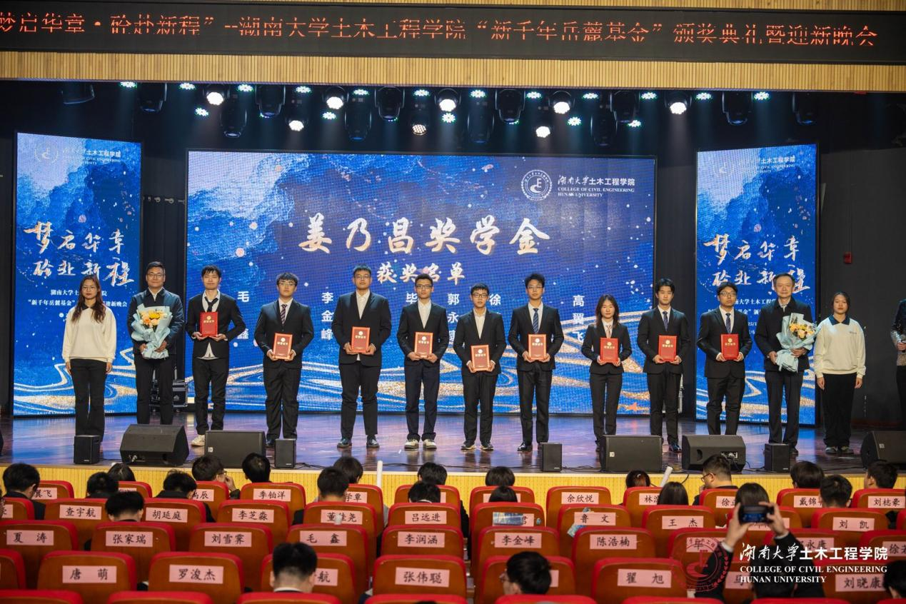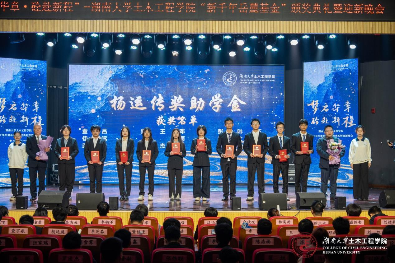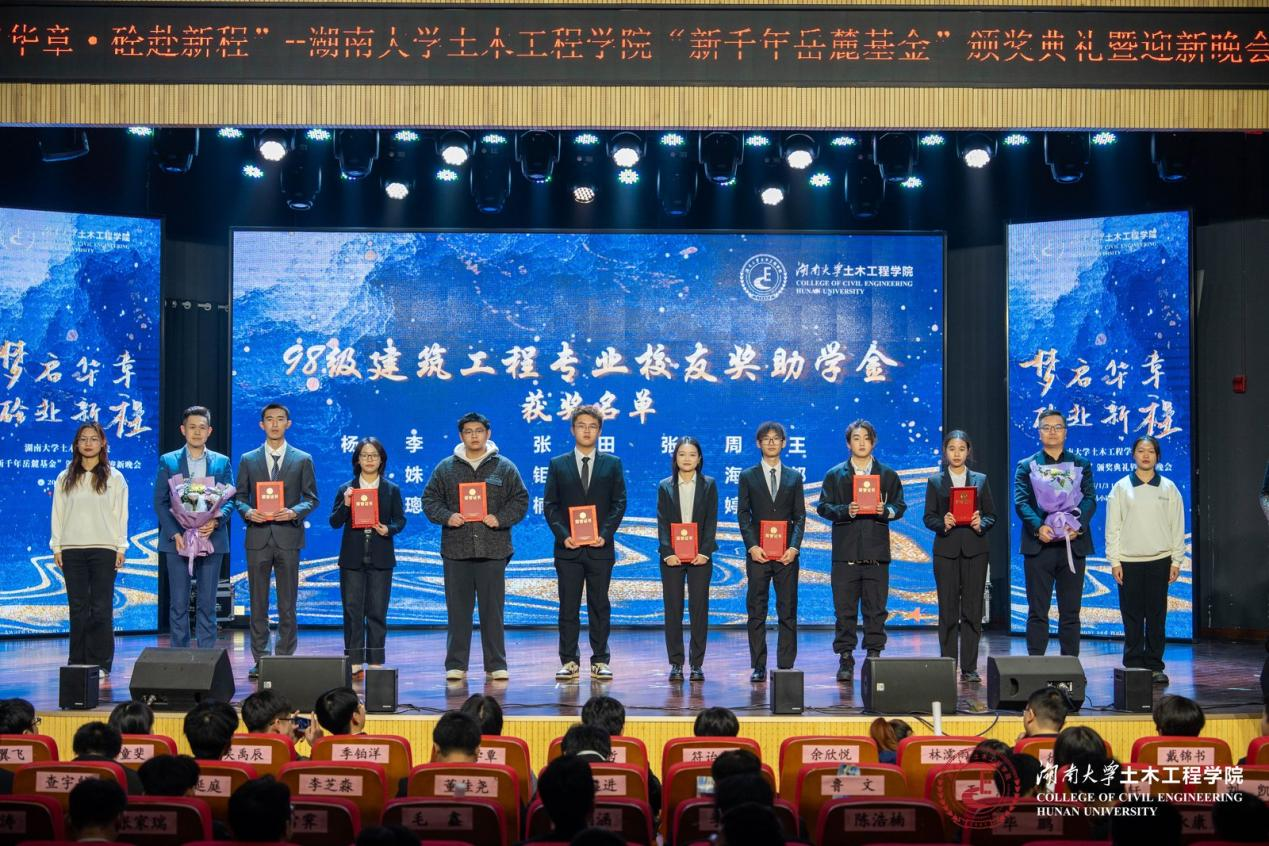 颁奖典礼上,设奖方代表和公司领导老师依次登台,为荣获 “新千年岳麓基金”的个人和集体颁发荣誉证书。96 级员工、qy球友会广州员工会常务理事李天兵作为设奖方代表分享设立“姜乃昌奖学金”背后的故事,他表示希望湖大土木人在未来机遇与挑战并存的浪潮中勇立潮头。“2004 级奖学金”获得者、本科生代表陈鹤一以“追梦青春”为题讲述大学成长故事,顺天综合奖学金”获得者、研究生代表张吉仁分享科研路上与 “风” 较量的历程,他们的故事激励大家脚踏实地、厚积薄发,争做时代 “驭风者”。