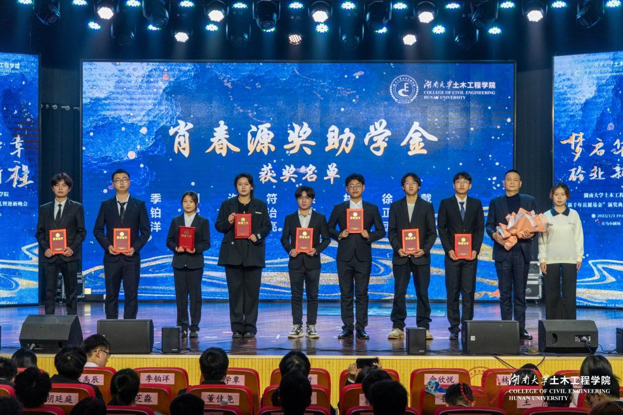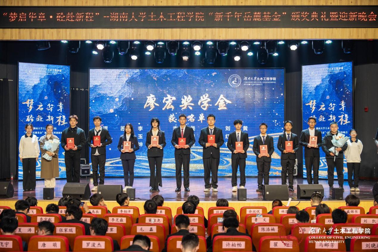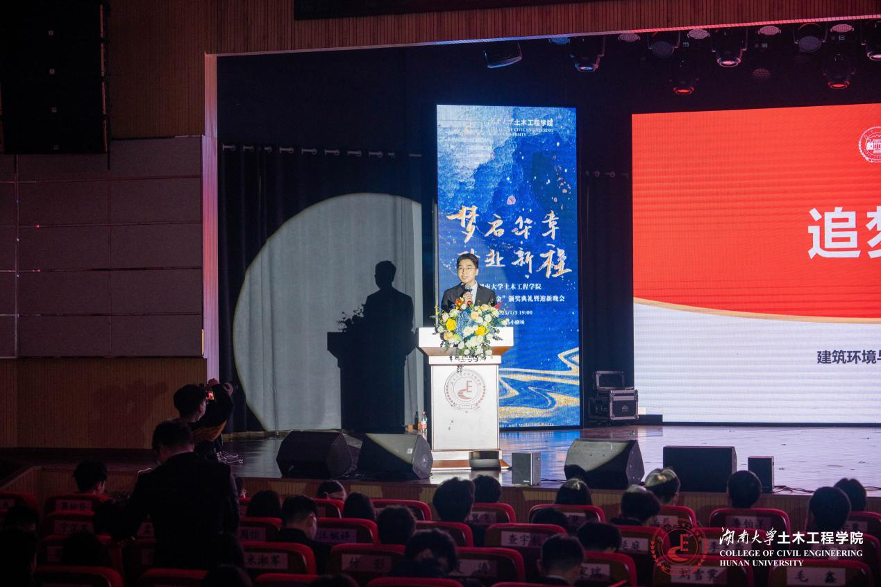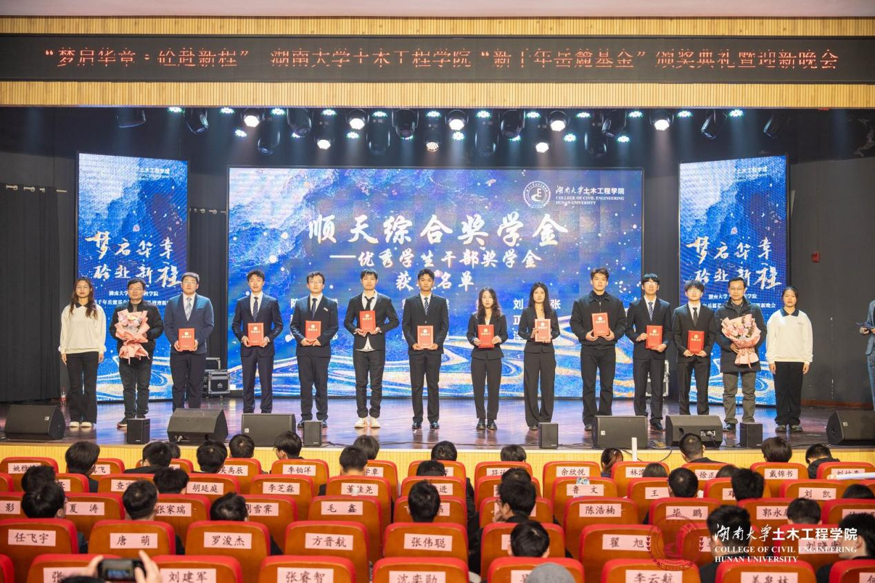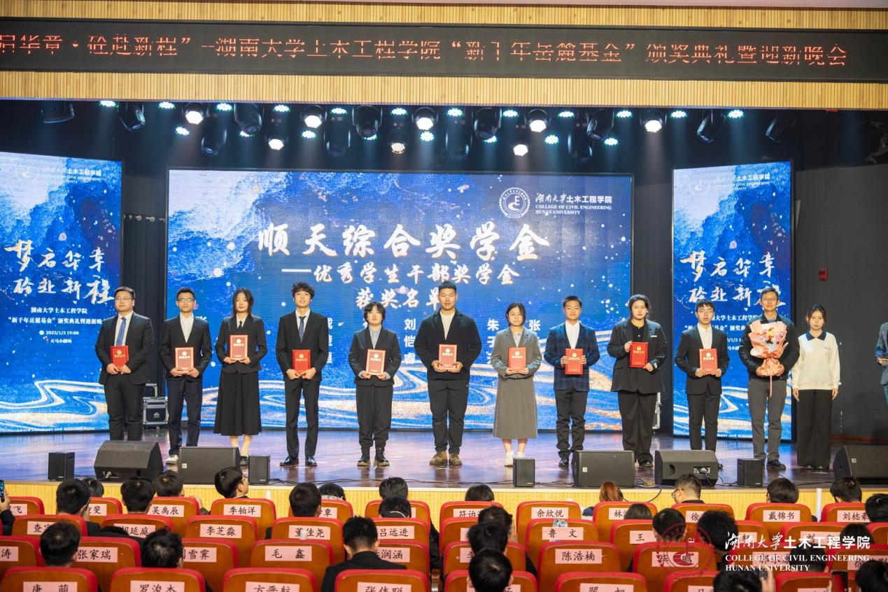 颁奖典礼上,设奖方代表和公司领导老师依次登台,为荣获 “新千年岳麓基金”的个人和集体颁发荣誉证书。96 级员工、qy球友会广州员工会常务理事李天兵作为设奖方代表分享设立“姜乃昌奖学金”背后的故事,他表示希望湖大土木人在未来机遇与挑战并存的浪潮中勇立潮头。“2004 级奖学金”获得者、本科生代表陈鹤一以“追梦青春”为题讲述大学成长故事,顺天综合奖学金”获得者、研究生代表张吉仁分享科研路上与 “风” 较量的历程,他们的故事激励大家脚踏实地、厚积薄发,争做时代 “驭风者”。
