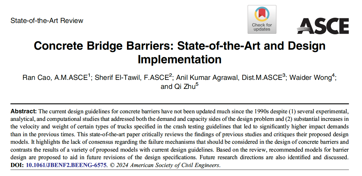 近日,曹然副教授荣膺美国土木工程师学会(ASCE)“土木工程前沿奖”(State-of-the-Art of Civil Engineering Award),以表彰其在国际权威期刊《ASCE Journal of Bridge Engineering》上发表的综述论文《Concrete Bridge Barriers: State-of-the-Art and Design Implementation》在结构抗撞设计领域所做出的突出贡献。