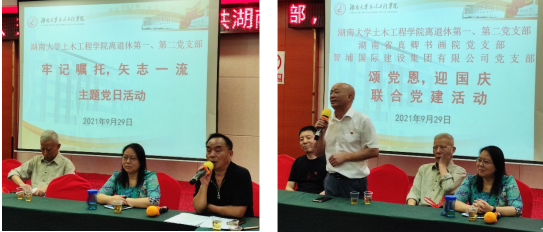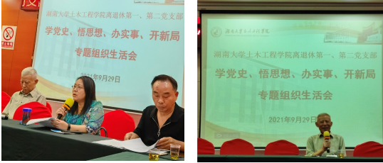 会议第二阶段是土木公司离退休第一、第二党支部“牢记嘱托 矢志一流”主题党日活动。邓铁军书记首先发言,他回顾了去年习近平主席参观岳麓书院的场景,同时谈了自己对双一流建设的认识。他退休这两年正是土木公司工程管理专业国家一流专业申报的关键时期,作为专业的领头人,虽然退居二线,他不遗余力做了大量工作,最近还跟公司领导、工程管理系主任等同志到武汉、天津等地参加会议,走访兄弟院校,希望扩大影响,为今年的双一流专业评选做最后的冲刺。会上,施楚贤等同志也先后发言,就双一流建设、新冠疫苗的接种和摸底等工作提出了建议和意见。