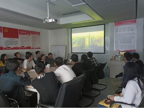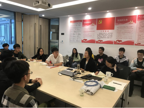 参观完公司后,便开始了本次活动的重头戏:前辈座谈交流会。在市政公司党员活动室,张经理、陈学姐、徐学长和吴学长、胡学姐和同学们进行了亲切交流。首先,徐学长给同学们介绍了市政院的党建工作,播放了省院的宣传片,介绍了市政院目前的业务范围和经营情况。